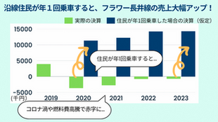 たとえば、沿線地域(長井市、南陽市、川西町、白鷹町)の住民約7万8千人が、一人年1回初乗り料金(190円)で乗車した場合、1年間で約1千5百万円の売上げ増となり、フラワー長井線の売上げ維持に大きく寄与することができます。