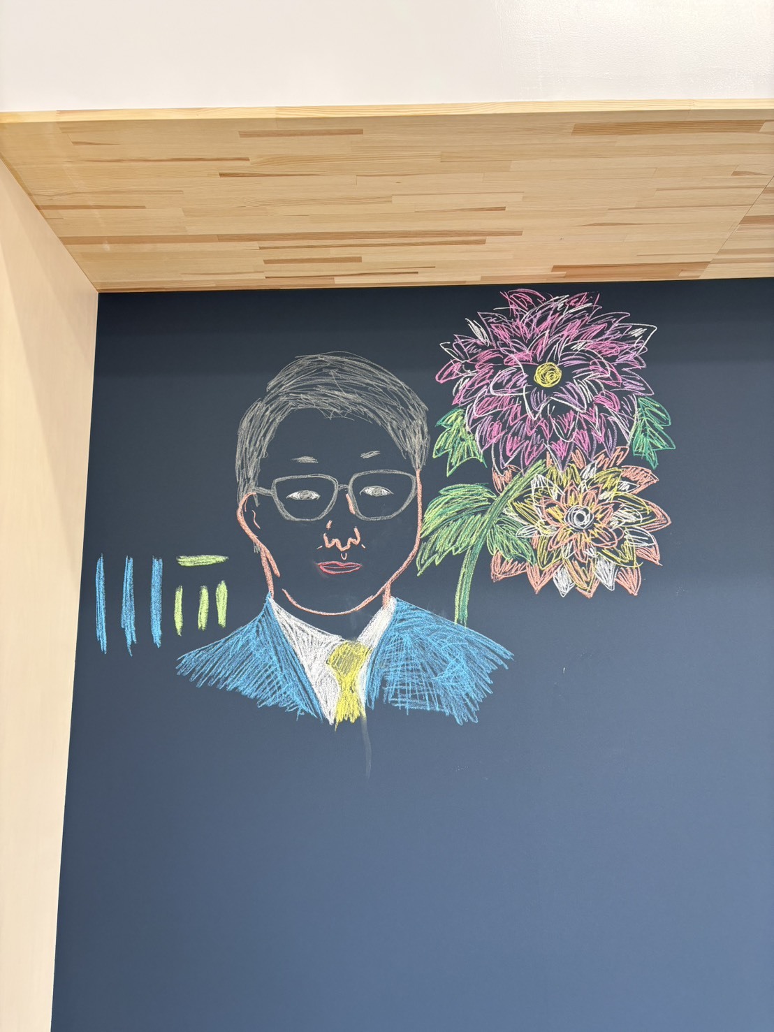 親子ルーム内のチョークで自由に絵を描ける壁に、素敵なイラストを描いていただきました。