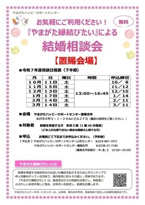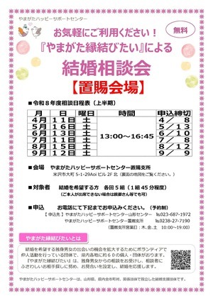 『やまがた縁結びたい』は独身男女からの相談をお受けし、相談者にふさわしいお相手探しに努め、お見合いを設定し、結婚を応援します。